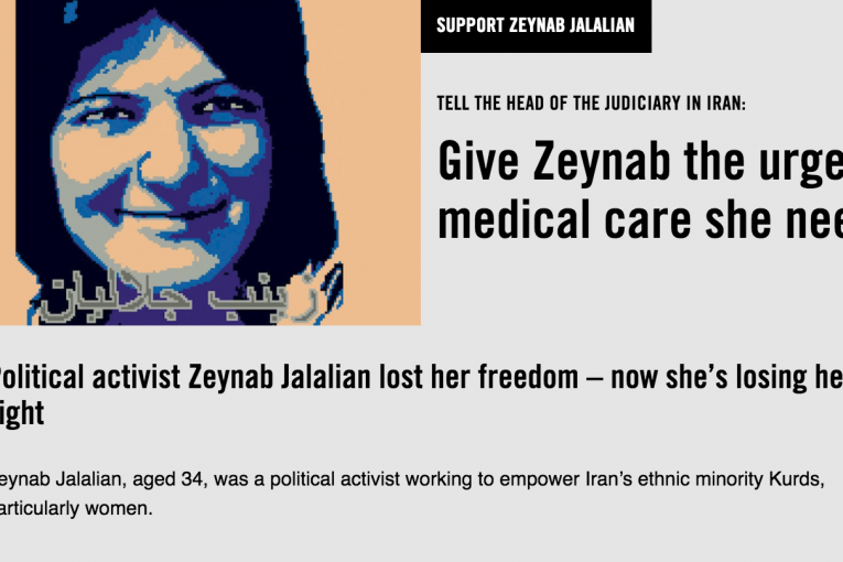 به گزارش تارنگار حقوق بشر در ایران به نقل از عدالت برای ایران، اعضا و داوطلبان عفو بین الملل در سراسر جهان میلیونها نامه برای توقف نقض حقوق بشر مینویسند. امسال، زینب جلالیان به عنوان زندانی سال این کارزار از ایران شناخته شده است. او تنها زندانی سیاسی از ایران است که به همراه یازده نفر دیگر، عفو بین الملل حداکثر کوشش خود را برای آزادی او خواهد کرد.