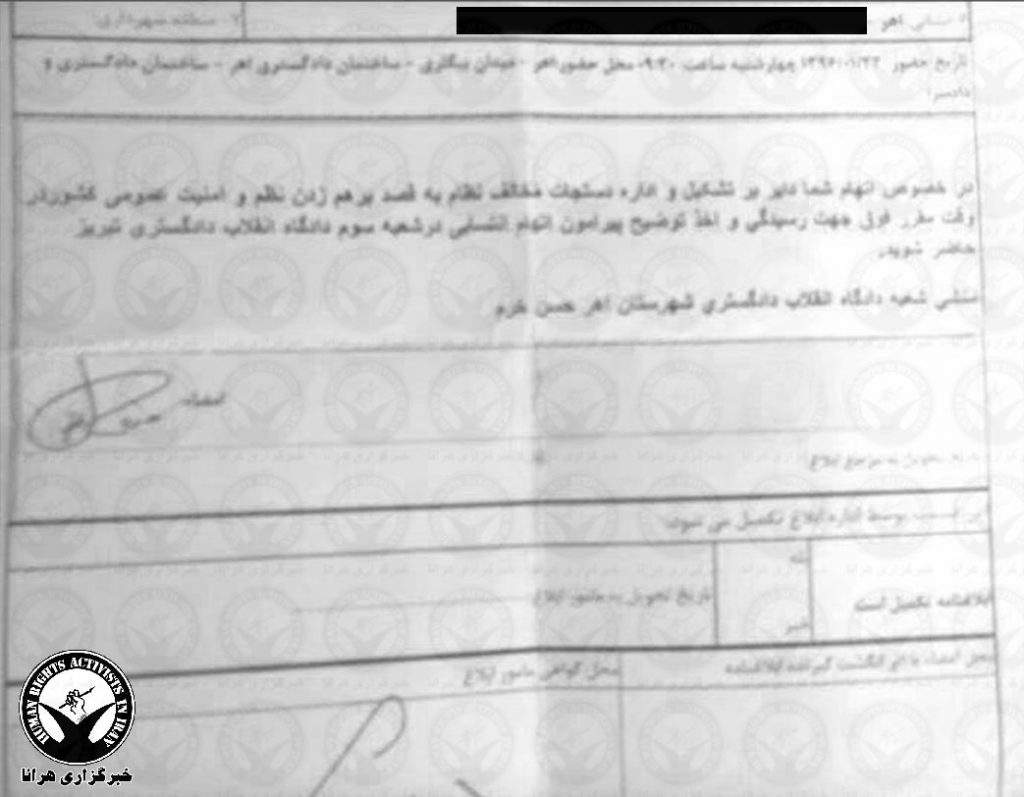 «عضویت در دستجات مخالف نظام به قصد برهم زدن امنیت کشور» اتهام مطرح شده در این احضاریه است.